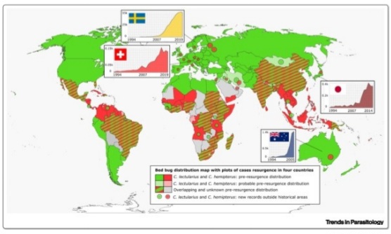 • 빈대(Cimex lectularius)는 전 세계, 열대빈대(Cimex hemipterus)는 열대 및 아열대 지역에